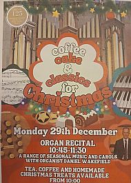 Tea coffee and a range of home made Christmas treats from 10.00 am Organ Recital 10.45- 11.30 featuring a range of seasonal music and carols wi our church organist Daniel Wakefield |